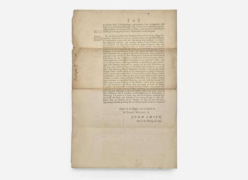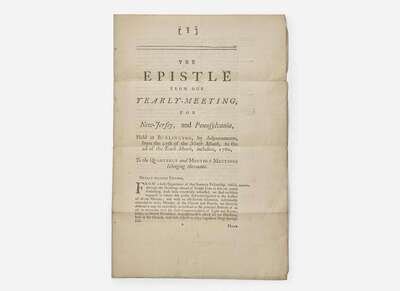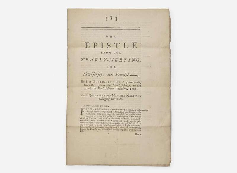 A rare Benjamin Franklin printing of the Quaker Epistle from the 1760 Yearly-Meeting, featuring a caution against slave owning amongst Friends: “discourage the Practice of making Slaves of our Fellow Creatures, hath been visibly blessed with Success, we earnestly exhort that Friends do not abate of their Diligence in this weighty Matter, but continue in the Love which beareth long, and is kind, to labour with such, as having Membership with us, do, in any Manner, by buying, selling or keeping them, countenance the Trade, to inform their Understandings, and convince their Judgements, and some of us are firmly persuaded, that if this Care is diligently and honestly pursued, the Society will, in Time, come up more universally in fulfilling the the Evangelical Law of Righteousness in this Respect.”