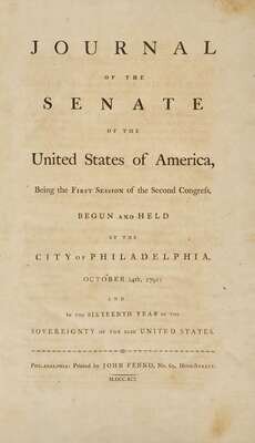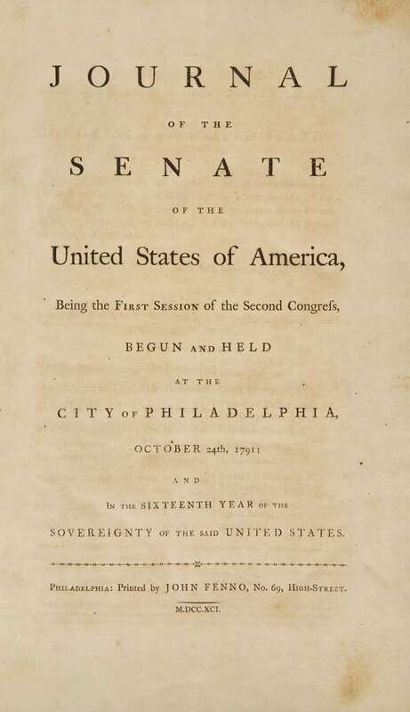 An important pair of Senate journals from the Second Congress of the United States. Published during the emergence of the national partisan political divide, the legislative actions described include the official ratification of the Bill of Rights, the passage of the whiskey tax that would result in the Whiskey Rebellion of 1794, the Northwest Territory Acts, the Judiciary Act of 1793, and much more.
