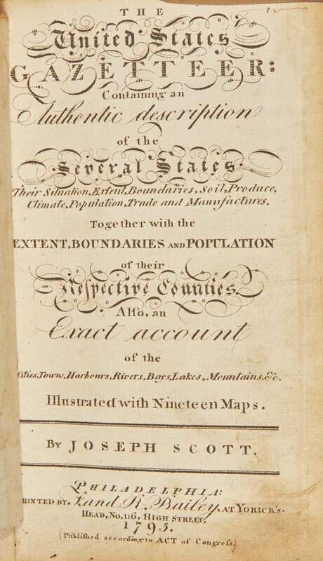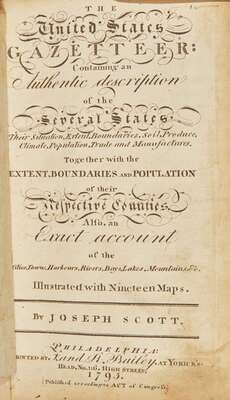 First edition of the first gazetteer published in the United States, containing detailed maps of Connecticut, Delaware, Georgia, New Jersey, Kentucky, Maine, Maryland, Massachusetts, New Hampshire, New York, North Carolina, Pennsylvania, Rhode Island, South Carolina, Vermont, Virginia, as well as some of the earliest maps of the Western frontier, and a large folding map of the United States.