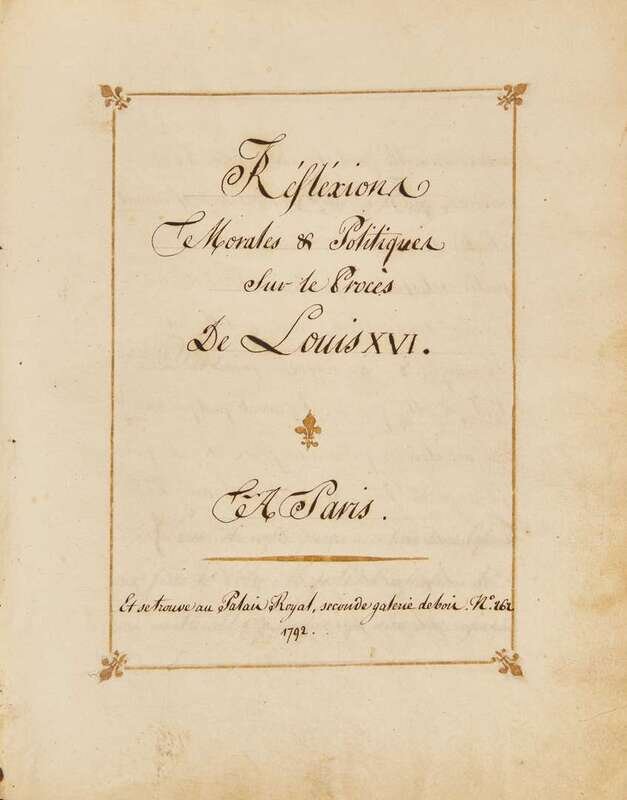 A fine manuscript account of the trial of French King Louis XVI, presented to his brother King Louis XVIII by French General Jean-Baptiste Durand, Baron d"Herville (1749-1830). Baron d'Herville was a lawyer in the Royal Court at Paris and a French General who fought in the Napoleonic Wars. He was appointed a member of the Legion of Honor in 1805, and was created Baron of the Empire by Napoleon in 1808. In September, 1814 he was awarded a commander's cross by Louis XVIII. It is likely that d'Herville gifted this manuscript to King Louis XVIII as a sign of his loyalty and to curry favor with the new monarch following the Second Restoration.