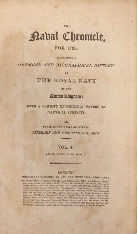 A rare, complete set of this periodical. The Naval Chronicle was a monthly magazine published in London in parts from January 1799 to 1818, during the period from the Napoleonic Wars through to the War of 1812. Each issue featured an extensive number of reports of naval battles, including lists of captured and wrecked vessels; news of promotions, retirements and deaths; biographical sketches and first-hand battle accounts; and more news and gossip generally related to the affairs of the Royal Navy.
