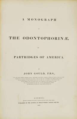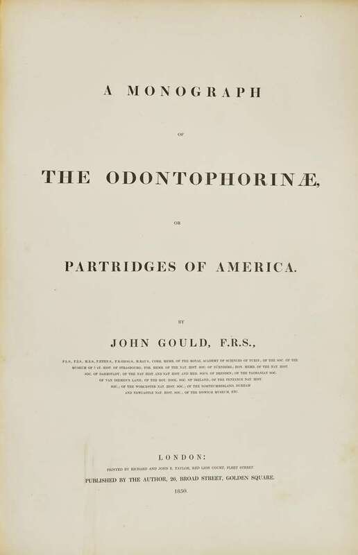 Handsome copy of the first edition of Gould's fourth monograph, in which he considerably enlarged the number of recorded species of the American partridge family. Originally issued in three parts between November, 1844 and November, 1850.