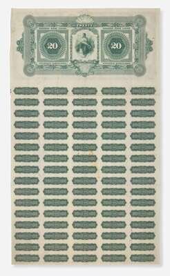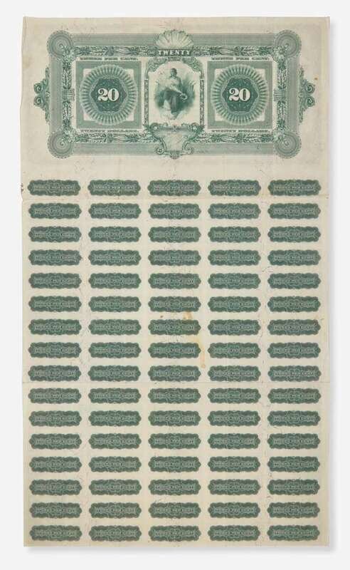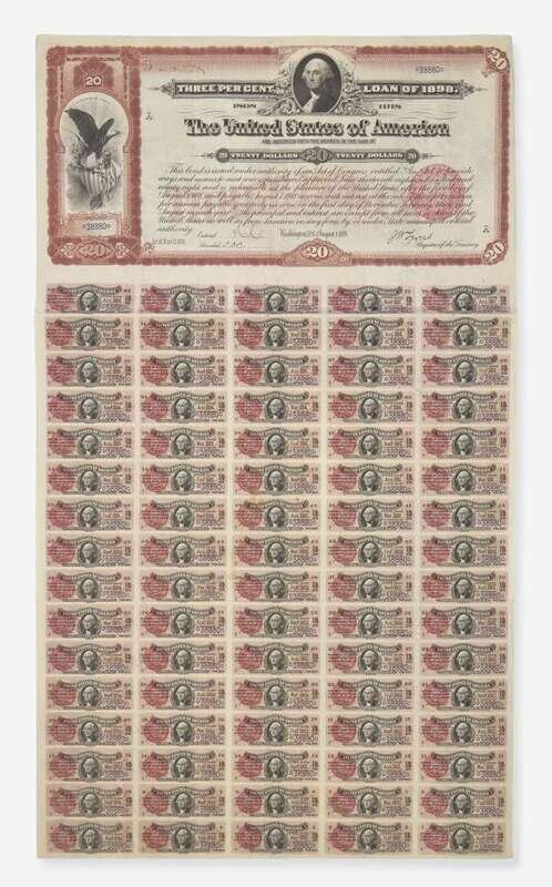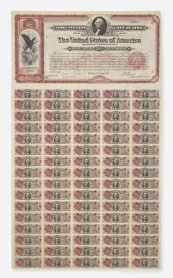 A rare 1898 $20 bond, issued to help fund the Spanish-American War. The 3 per cent loan of 1908-1918, popularly termed the Spanish American War loan, was issued in June, 1898. Subscriptions were invited for $200,000,000 and in response, 320,226 subscriptions were received, amounting to more than $1,500,000,000, of which $198,792,660 were allotted. This lower denomination bond was an affordable option for the public, and appealed to an individual's patriotism. According to the Joe I. Herbstman Collection of American Finance, there are less than twenty known examples of this denomination.