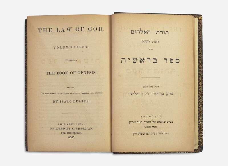 The first Jewish translation of the Torah into English, in an elaborate contemporary binding. Translated and edited by Isaac Leeser, a pioneering figure in Jewish American cultural life who laid the foundations for many of America's key Jewish institutions. Born in Germany, Leeser emigrated to America as a teenager in the hopes of attaining better opportunities. First working for his uncle in Virginia, his rise to prominence in America's Jewish community began following the publication of his article in the Richmond Whig that defended Judaism against an anti-Semitic article published in the London Quarterly. He was subsequently invited to serve as cantor and acting rabbi of Philadelphia’s Sephardic Congregation Mikveh Israel, where he gave hundreds of sermons and where he introduced vernacular preaching. In this capacity and with the opening of Rebecca Gratz's Sunday School, in 1838, Leeser felt compelled to address the lack of proper English translations of Jewish texts for his congregation, and set to work on the current work. With this publication--as well as his translation of the complete Hebrew Bible (1853), his establishment of the magazine, The Occident and American Jewish Advocate (1843-69)--Leeser laid the groundwork for a thriving American Jewish press, and helped give voice to America’s antebellum Jewish community.