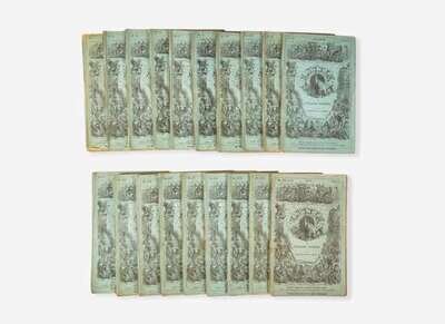 London: Bradbury & Evans, December, 1855-June, 1856. 20 parts in 19 volumes. First edition, first issue, in original monthly parts (with "Rigaud" for "Blandois" in No. XV, and Author's correction slip in No. XVI). Illustrated with an etched frontispiece, etched vignette title-page, and 38 etched plates by Hablot K. Browne ("Phiz"), including the eight “dark plates”. Publisher's limp printed blue-green wrappers, light to moderate wear along extremities and spines, spine largely darkened as usual; lacking second ad slip in No. V, all ads in Nos. VIII, XII, and XVII, and second ad in No. XVIII; plates foxed as usual; in quarter burgundy morocco lift-off case and chemise. Hatton and Cleaver, pp. 305-330; Eckel, pp. 82-85