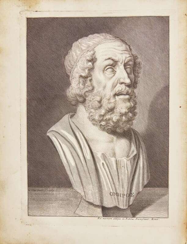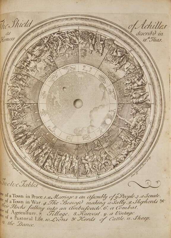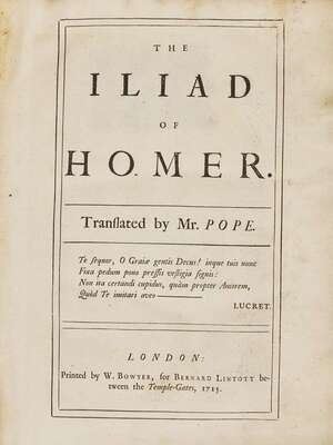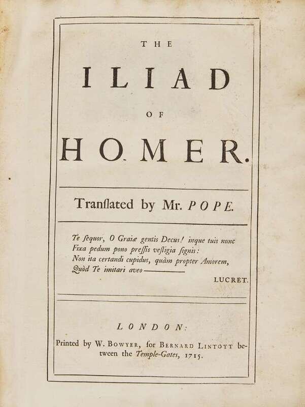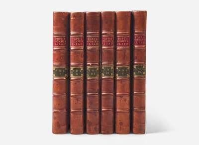 First edition of the subscribers' quarto issue of Alexander Pope's famous illustrated translation of Homer's Iliad. Esteemed by Samuel Johnson as "certainly the noblest version of poetry which the world has ever seen." The six volumes were issued between 1715-20, with only 650 copies printed in quarto for the 575 subscribers. Illustrated with a fine engraved frontispiece portrait bust of Homer by George Vertue, a double-page map, the "Shield of Achilles" plate in Vol. V (often missing), and numerous elaborate head- and tail-pieces.