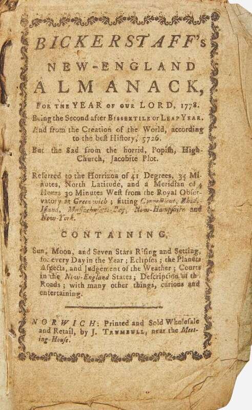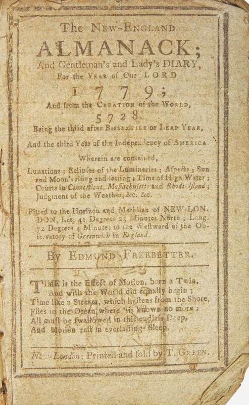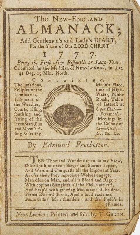 New-London: Printed and Sold by T. Green, (1776). 12mo. (24) pp. Illustrated with lunar woodcut on front wrapper. Printed self-wrappers; edges untrimmed; creasing in corners; light soiling to title-page; scattered contemporary marginalia. Evans 14724; Drake 310