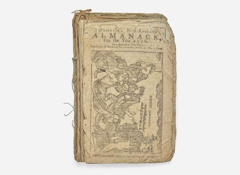 New-London: Printed and Sold by T. Green, (1775). 12mo. (22) pp.; lacking final leaf. Illustrated with woodcut of Paul Revere's “The able Doctor, or America Swallowing the Bitter Draught” on front wrapper, with printed caption “Boston Cannonaded”; wood-cut anatomical chart on p. (21). Printed stab-sewn self-wrappers, first leaf loose, extremities creased and worn; edges untrimmed; scattered contemporary marginalia. Bound with below with contemporary thread. Evans 14001; Drake 305