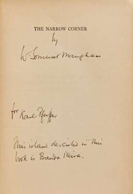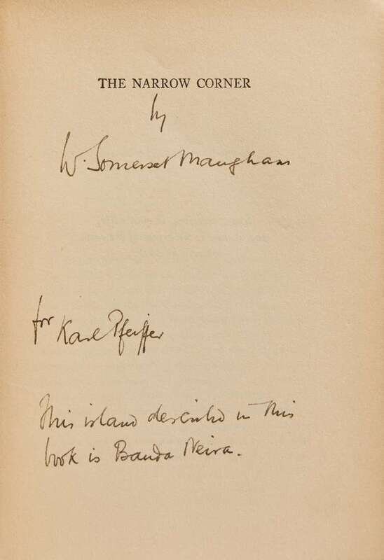 Garden City: The Sun Dial Press, Inc., 1937. Hampton Court Edition. 8vo. (iv), 314, (1) pp. Presentation copy, inscribed by Maugham on half-title to his friend, the writer Karl G. Pfeiffer: “by W. Somerset Maugham / for Karl Pfeiffer / This island described in this / book is Banda Neira.” Publisher's dark blue cloth, stamped in orange and in gilt, spine and gilt faded; orange endpapers; scattered annotations underling in pencil to text, presumably by Pfeiffer; in red cloth fall-down-back box.