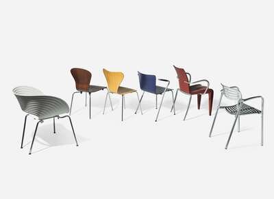 Comprising production examples of: Philippe Starck, “Louis 20” armchair for Vitra; Ron Arad, “Tom Vac” chair for Vitra; Arne Jacobsen, “Series 7” chair for Fritz Hansen; Ross Lovegrove, “Sprite” side chair for Knoll; Jorge Pensi, “Toledo” chair for Knoll; and Vico Magistretti, “Vico Duo” chair for Fritz Hansen