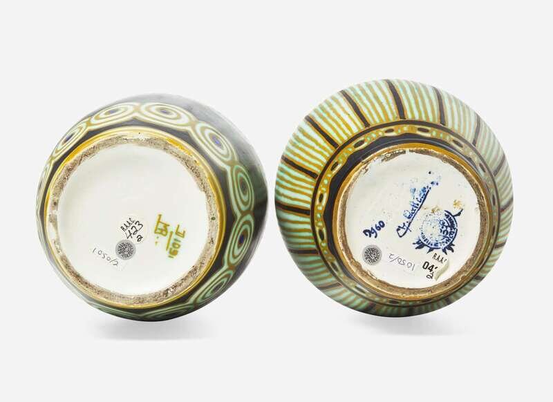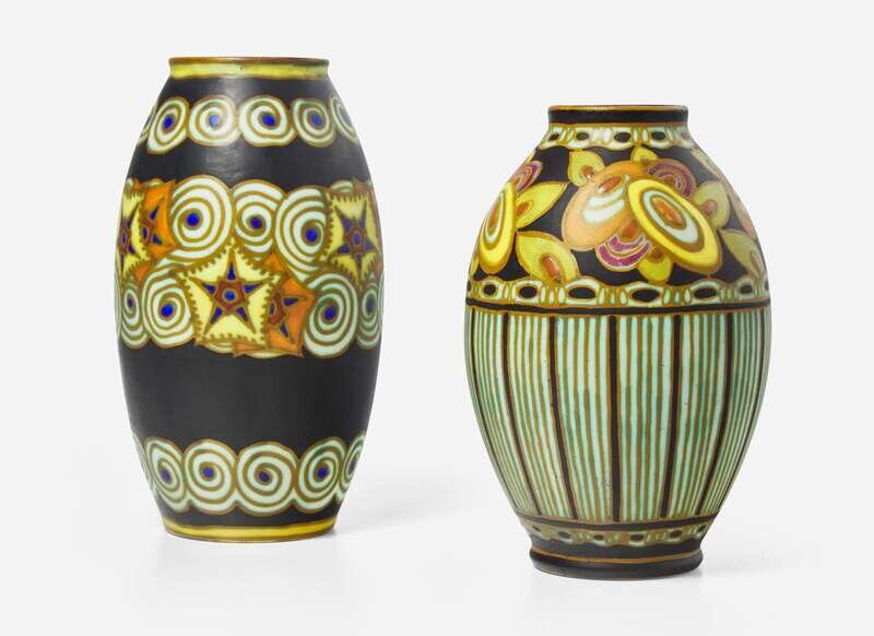The shorter vase impressed “899” and stamped in indigo “Ch. Catteau” with circular Boch Frères stamp