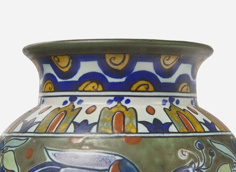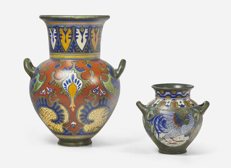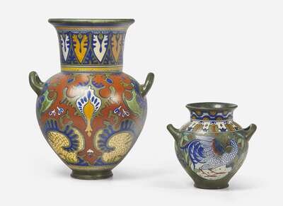 Comprising a smaller handled vase retailed by Liberty & Co. and a large floor vase