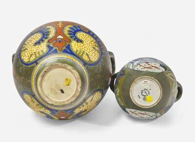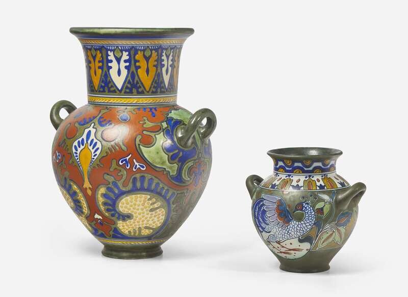 The smaller vase stamped “022 C" and marked to underside: 022, Liberty & Co, Made in Holland, L"