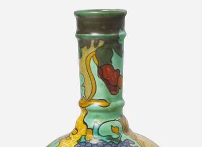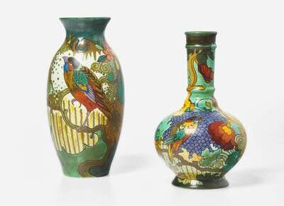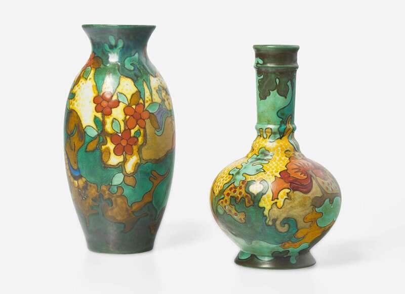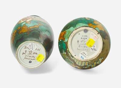 Comprised of a bottle-form vase in “Bejo” pattern, date code for 1921; and an ovoid vase in the “Golden Ete” pattern, date code for 1923