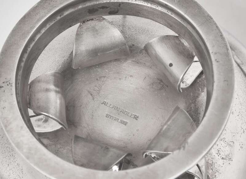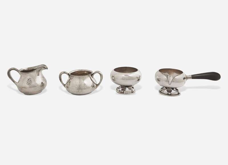 Comprising a footed creamer and sugar (the creamer with stick handle) by Allan Adler of Los Angeles and a creamer and sugar with applied monogram by Lebolt & Co. of Chicago