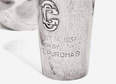 One jug with applied monogram, the tumbler with applied monogram and engraved “AUGUST 14, 1937 / WON BY / R.W.T. PURCHAS”