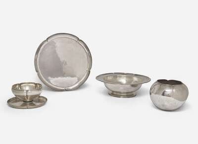 Comprising a flower bowl, a sauce bowl with attached liner (with ebony spacer between bowl and liner), a circular tray and a large footed circular bowl