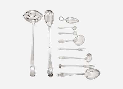 Comprising a large ladle, stuffing spoon with pierced handle, table spoon with pierced handled, sauce ladle, a tea caddy spoon, a leaf-form tea caddy scoop, two individual salt spoons, and two pickle forks (one in the Onslow pattern)