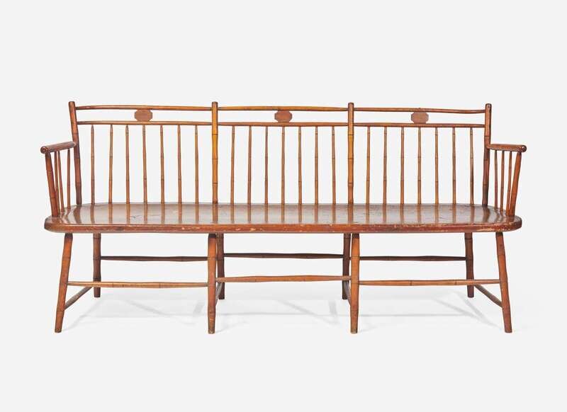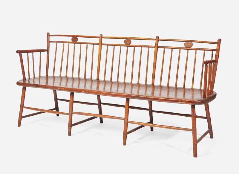 section of the bird-cage crest rails, with plank seat on bamboo legs connected by stretchers.