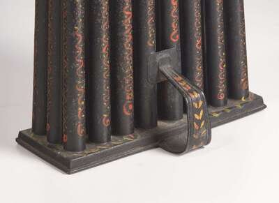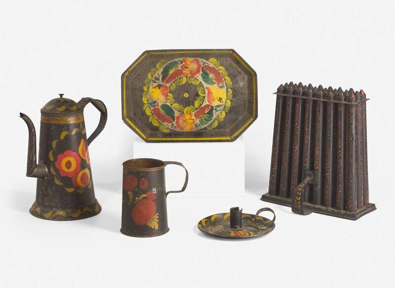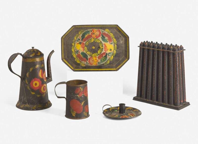 A group of five tole or painted and decorated tinware table items, probably Pennsylvania, 19th / 20th century