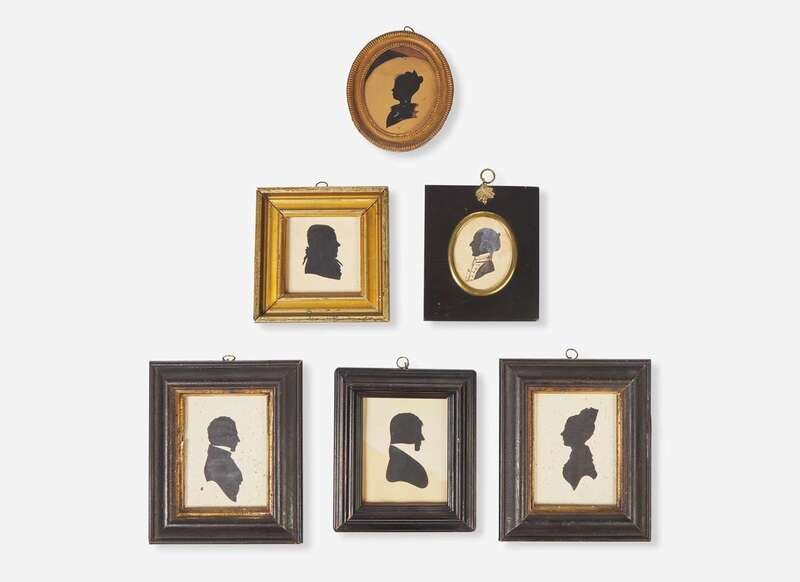 Comprising a pair of hollow-cut profiles of a lady and gentleman, framed; a hollow-cut profile of a man, gilt frame; a hollow-cut profile of a young lady, oval pressed gilt metal frame; a drawn profile of a man heightened with white, watercolor and ink, framed; and a cut-out profile of a young man, framed.