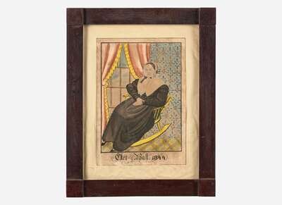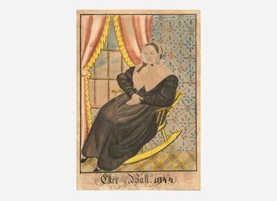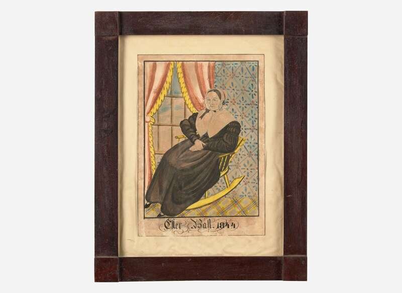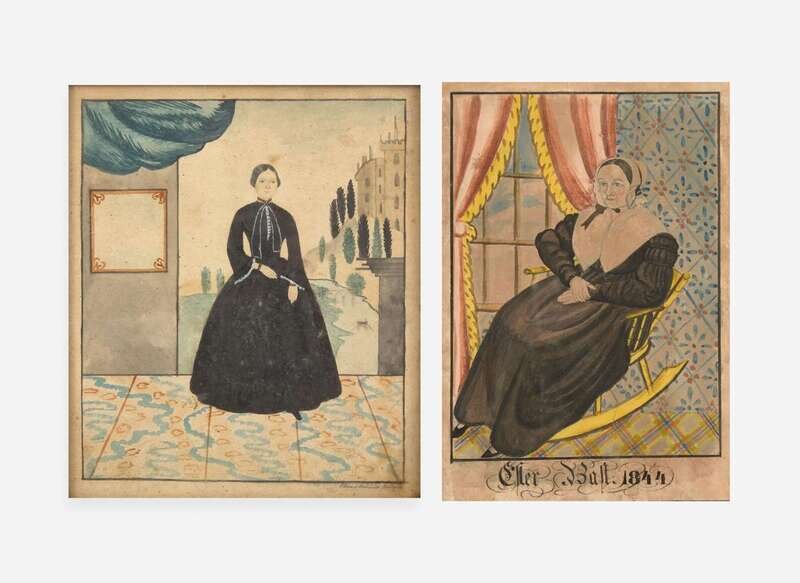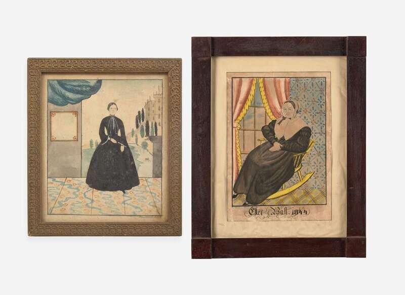 The portrait of Esther Bast shown depicting her seated in a rocking chair, inscribed and dated, “Esther Bast 1844,” l.c., retaining American Folk Art Gallery label verso, framed; the portrait of a lady shown depicting her on a veranda with castle and river landscape in the background, signed, “Edward Richards/ Newtown,” l.r., framed.