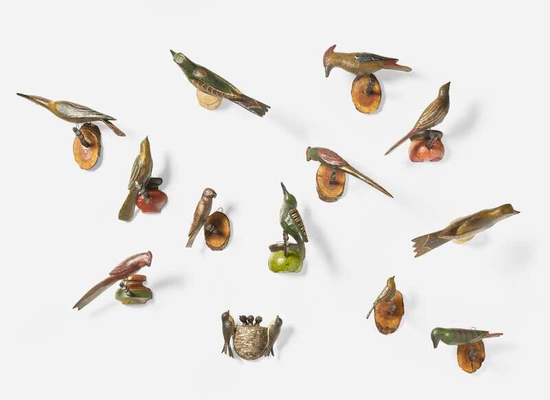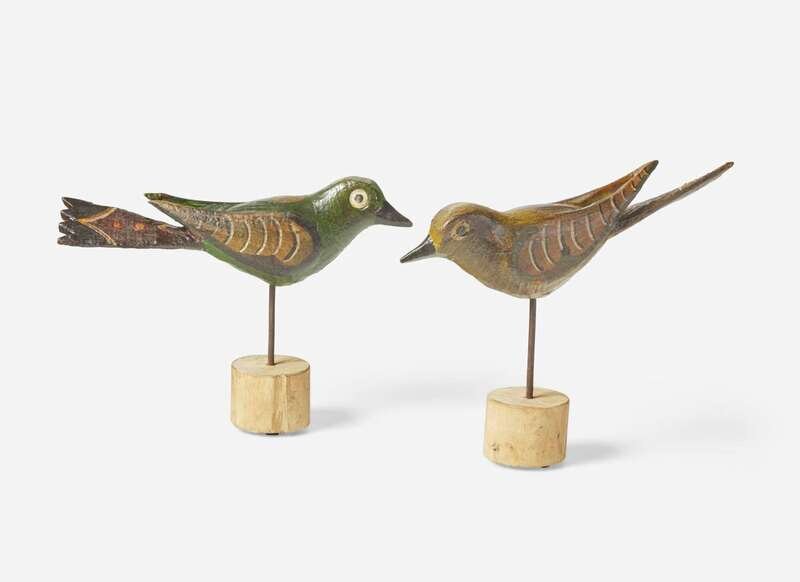 Of various sizes, wire or metal legs, all mounted on perches, nests, or stands.