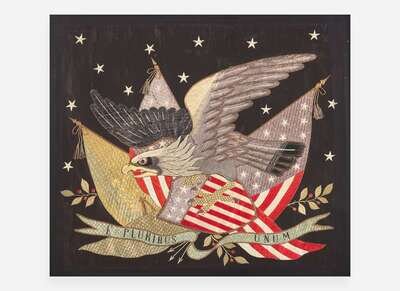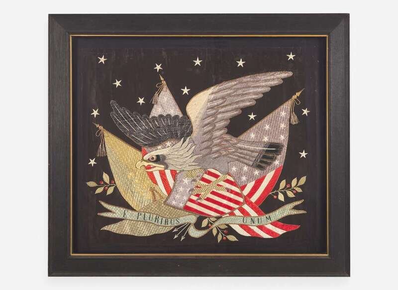 Worked with silk floss and metallic thread, emblazoned with stars, American eagle, Patriotic shield, and panoply of flags, with bannerette inscribed, “E. Pluribus Unum,” mounted and framed.