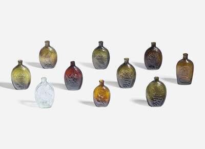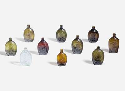 Comprising example by various makers including Westford Glass Co., Westford, Connecticut; depicting various Patriotic imagery including American eagle with shield, sheaths of wheat cornucopias, and profile portraits of presidents.