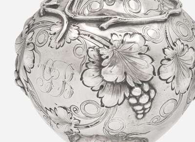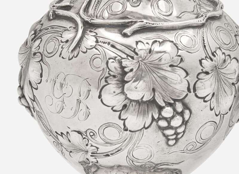 Comprising a small covered coin silver pitcher, by Canfield Bros. & Co., circa 1870, or the partnership between Ira C. Canfield (1808-1879), William Buckingham Canfield, T. Welsh, and J.R. Arminger, with scrolled branch-form handle and decorated with repoussé grapevine, on footed base, engraved with monogram, “GB,” marked to underside; a sterling silver covered sugar bowl by Reed & Barton, circa 1890s, with scalloped rim and base, lid with finial, two scrolled handles, and decorated with repoussé floral motifs, engraved with monogram, “W,” marked to underside; and footed coin silver bowl by Gelston & Co., circa 1837-1838, decorated with repoussé c-scrolls, flowers, and rocaille motifs, scrolled feet, with cartouche surrounding engraved armorial crest with motto, “Deo Duce Persever and Um,” marked to underside.
