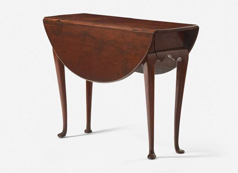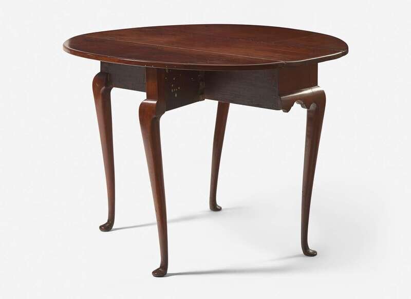Having an oblong top, flanked by D-shaped leaves, shaped apron, raised on cabriole legs ending in pad feet