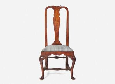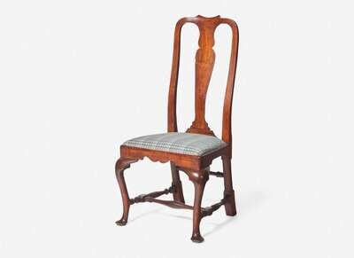 Having a yoked crest-rail over a vasiform splat, above a trapezoidal upholstered seat, frame with molded rails with rounded front corners and shaped front seat rail, cabriole legs ending in pad feet, raked square rear legs joined with rear, side, and medial off-set turned stretchers.