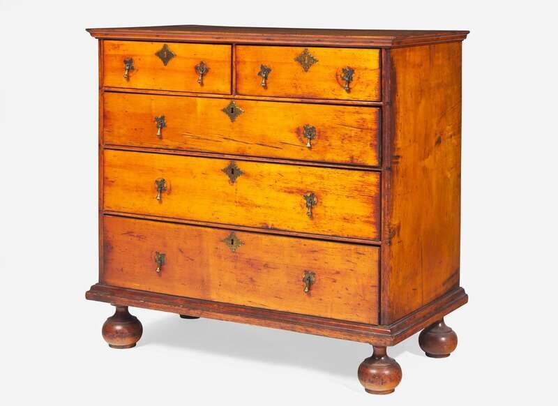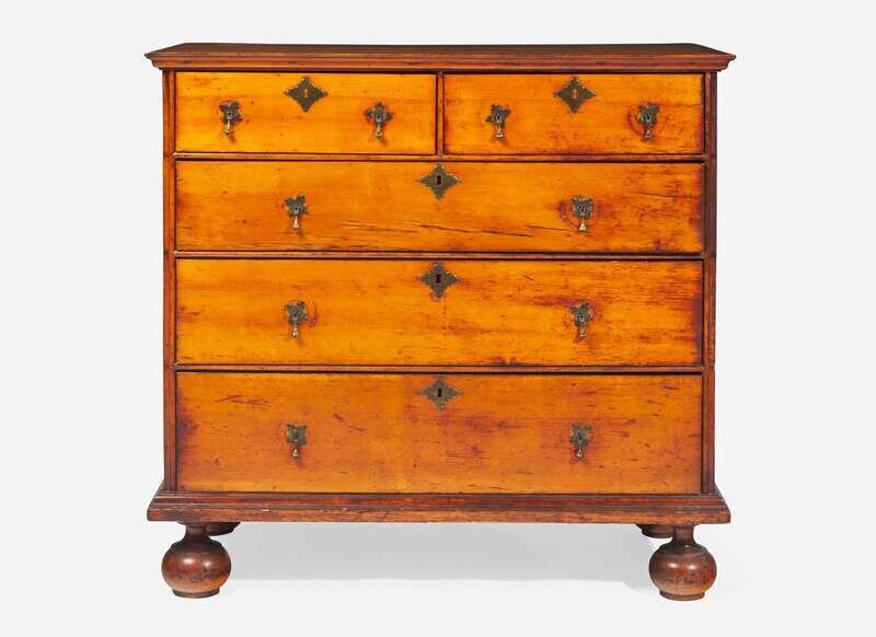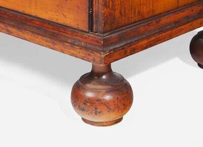 With rectangular molded top, above a series of two short drawers over three graduated long drawers, molded base, on bun feet.