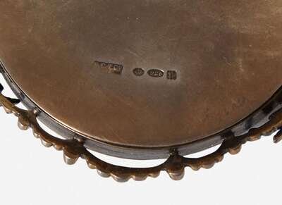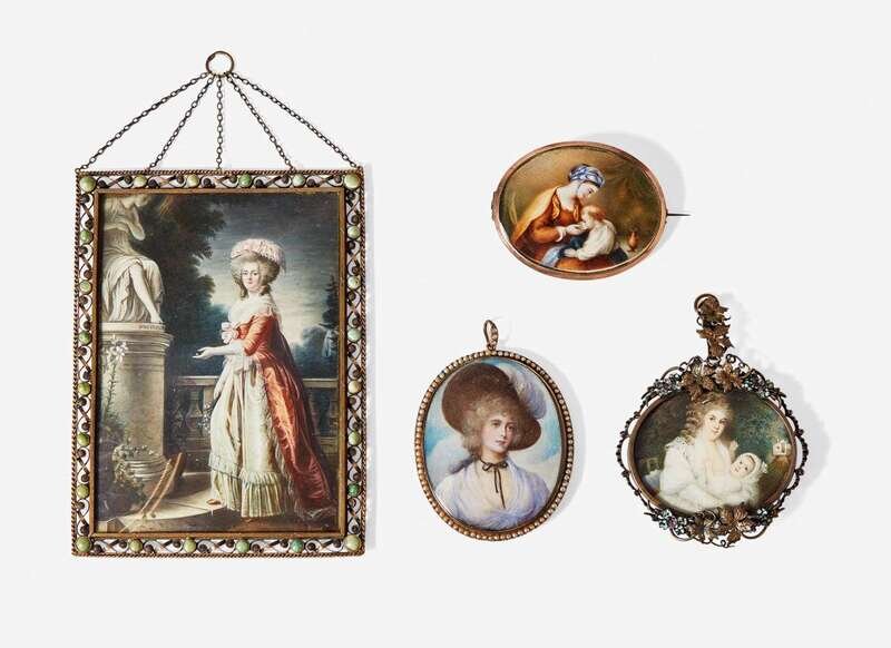 Comprising one large example depicting an 18th-century lady beside stone memorial, signed "Guiard," likely late 19th century, presented in a turquoise-encrusted gilt metal pierced frame; a portrait of a mother and child in front of house and wooded backdrop, English School, signed, "G Netsuke," (?), l.r., and signed and dated verso, "1821/ G Netsuke" (?) in an enamel decorated and gem-set gilt sterling silver pendant case, marked verso with London import mark, for B.C.T. Co. Ltd., 1908, marked "925"; a portrait of an 18th-century lady wearing a feathered hat, likely late 19th century, in a gilt pendant case with seed pearl surround; and a portrait of a mother feeding a child, mounted as a brooch in gilt case, with woven hairwork verso, probably early 19th century; all watercolor.