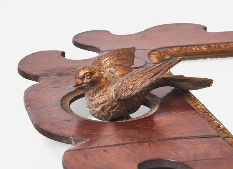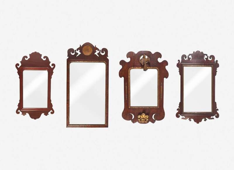 Comprising a Queen Anne example with fret-carved shell, two diminutive Chippendale examples, and a Chippendale example with boldly carved and gilt bird to crest and and foliate element to bottom.