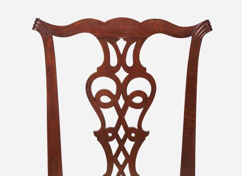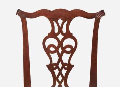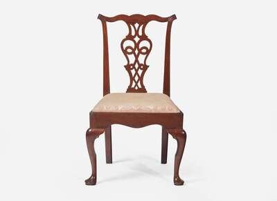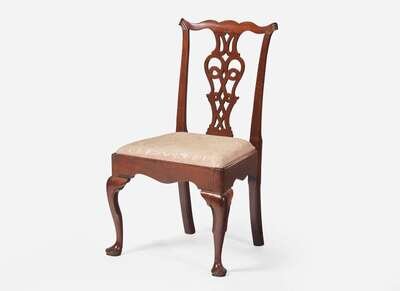 With shaped crest-rail, turned ears, pierced Gothic splat, shaped apron, on cabriole legs ending in pad feet.