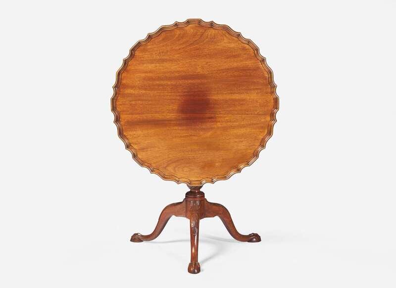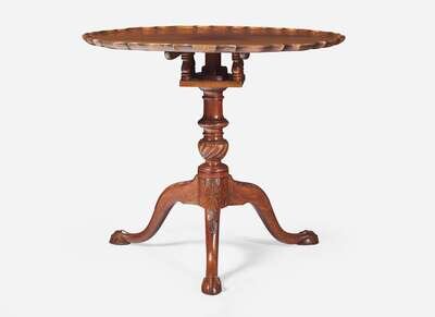 With scalloped molded top, on bird-cage, split baluster and urn support, on cabriole legs with acanthus-carved knees, on ball-and-claw feet.
