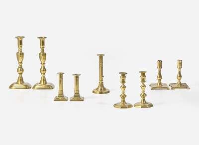 A collection of nine brass candlesticks, primarily English, 17th - 19th century