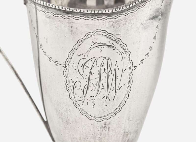 Of Classical urn-form, with bright-cut decoration including an oval cartouche engraved with monogram, "JSW," marked to underside, "P. Kirkwood," within rectangle, and "GW" twice as well as an eagle mark.