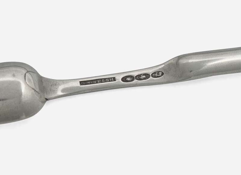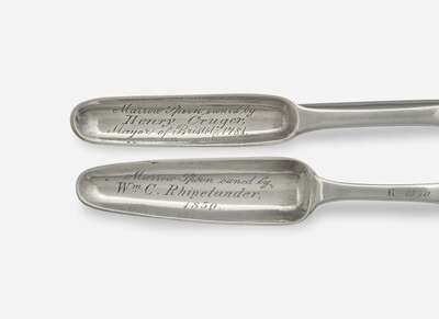 Comprising a double-side marrow scoop / spoon, by William Garret Forbes, with drop to bowl back, engraved to large bowl, “Marrow spoon owned by Henry Cruger/ Mayor of Bristol 1781," marked; a double-sided marrow scoop / spoon, by George W. Welsh, with drop to bowl back, engraved to large bowl, “Marrow spoon owned by Wm. C. Rhinelander, 1850,” engraved to handle with monogram and date, “R 1850,” marked; and a double sided marrow scoop / spoon, by maker “JW,” marked.