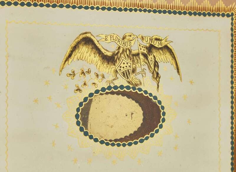 With églomisé tablet, decorated with sun and moon, and waist door, decorated with American eagle with Patriotic shield, the eagle holding laurel branch and American flag, with bannerette inscribed, “E. Pluribus Unum,” painted dial, brass steeple-form finial.