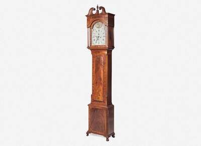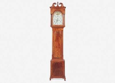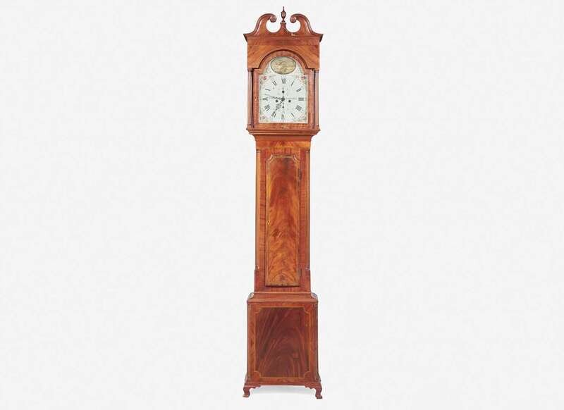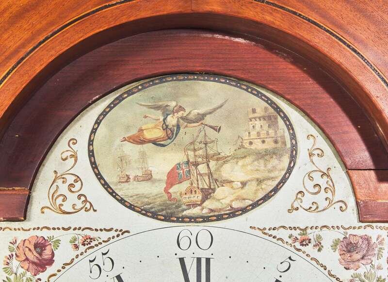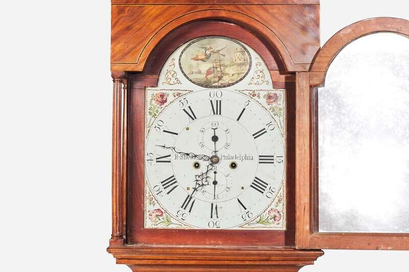 With line and ebony inlay, the hood with broken arch pediment with carved rosettes and finial, the arched door flanked by fluted columnettes, the case with shaped door, molded base on ogee feet, the enamel face with reserve depicting trumpeting angel over fortified coastline with British ships, and painted flowers to spandrels, inscribed, “R. Shearman/ Philadelphia.”
