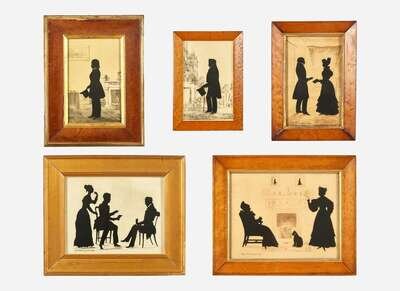 All cut-out silhouettes against drawn and ink-washed backgrounds; comprising a lady and gentleman in an interior setting, signed and dated, “Aug Edouart fecit 1828," l.l., bird's eye maple frame; a gentleman holding top hat in an interior setting, signed and dated, “Aug Edouart fecit 1842/ Philadelphia,” gilt and burl walnut frame; a gentleman standing on a veranda and holding top hat and cane, signed and dated, “Aug Edouart fecit 1832,” l.r., bird's eye maple frame, and bearing original “Monsieur Edouart” label verso; two ladies conversing by a fireplace with cat, signed and dated, “Aug Edouart fecit 1830,” l.l. bird's eye maple frame, and bearing original “Monsieur Edouart” label verso; and a group of three people (possibly not by Edouart) identified on old label verso, “1. Mme Rachel- actress/ 2. Mr. Samuel Warren- play write/ 3. Mr. Charles Kemble- tragedian/ London, Aug. 10th 1838,” and signed and dated, possibly dubiously, “Aug Edouart, fecit 1838," l.l., gilt frame, bearing old label for The Elizabeth L. Maurier Collection of Profiles (probably dubious).
