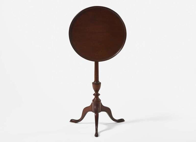 With dished top over birdcage mechanism, on tapered support with urn, on three cabriole legs ending in pad feet.