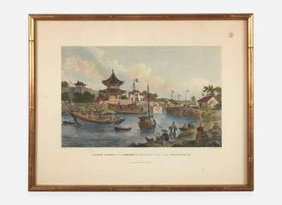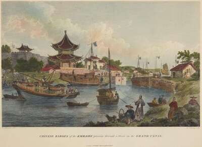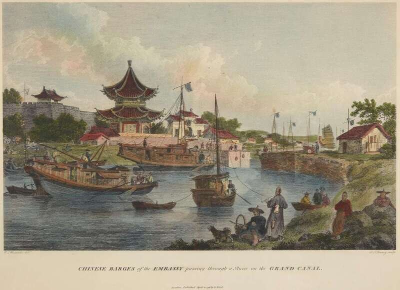 Hand-colored lithograph, inscribed, “Chinese Barges of the Embassy passing through a Sluice on the Grand Canal/ London, Publish April 12, 1796, by G. Nicol,” framed.