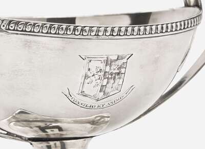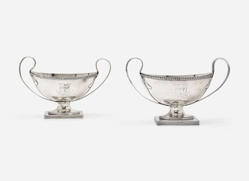 Of Classical form, each bearing armorial crest and banner inscribed, “Consilio Et Animis,” apparently unmarked.
