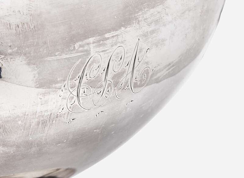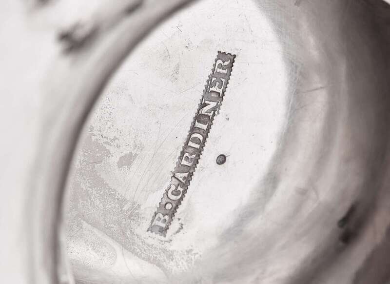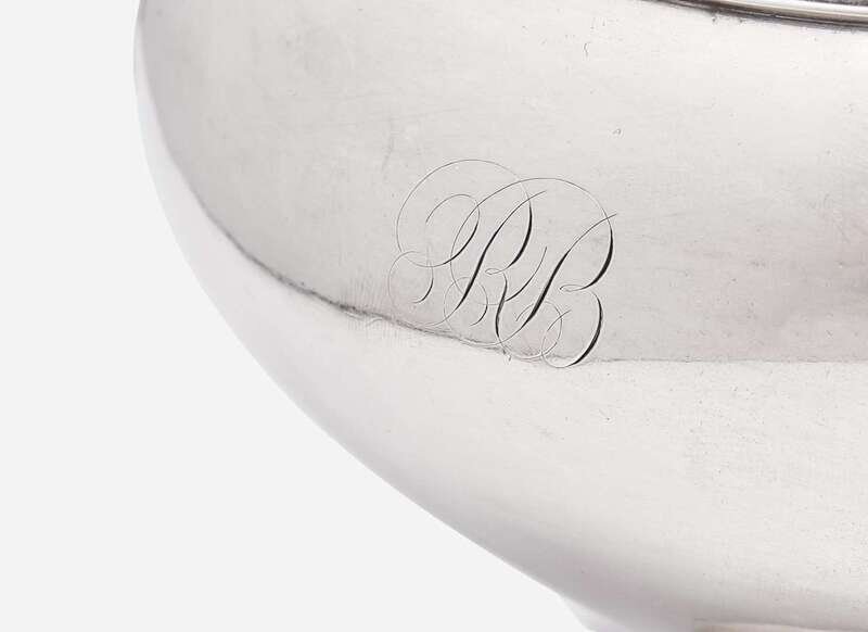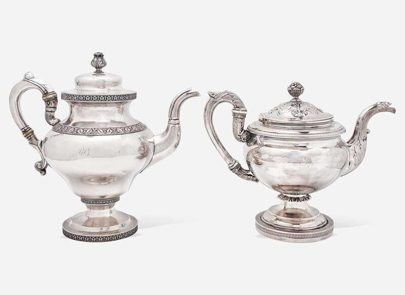 Comprising a coffeepot by Baldwin Gardiner, with bands of repoussé foliate motifs, scrolled handle, hinged lid with foliate finial, on footed base, engraved with monogram, “RB,” marked to underside; and a coffeepot by Thomas Fletcher, with patterned bands, scrolled handle, hinged lid with anthemion and acanthus motifs and foliate finial, on footed base, engraved with monogram, “CSA,” marked to underside.