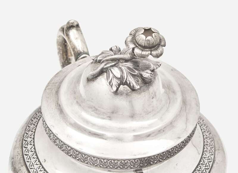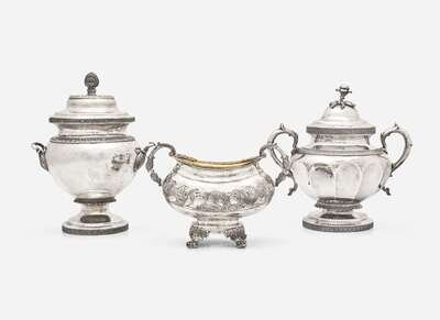 Comprising a covered sugar bowl by Eoff & Connor, or the partnership between Garrett Eoff (1779-1845) and John Henry Connor (1809-1854), with two handles, a lid with finial, and bands of repoussé shell and foliage on footed base, marked to underside; a covered sugar bowl by Nicholas James Bogert, with lobed body, two handles, a lid with floral-form finial, and bands of repoussé motifs, on footed base, the body inscribed, “Parker,” marked to underside; and a sugar bowl, by maker “IAE,” of oblong form, with gilt washed interior, two handles, gadrooned and chased rim, the body decorated with band of Classical motifs including sea-griffins, cornucopias, anthemion, and laurel motifs, on footed base with paw-form feet, the base faintly inscribed with name and date, “1823,” marked to underside.