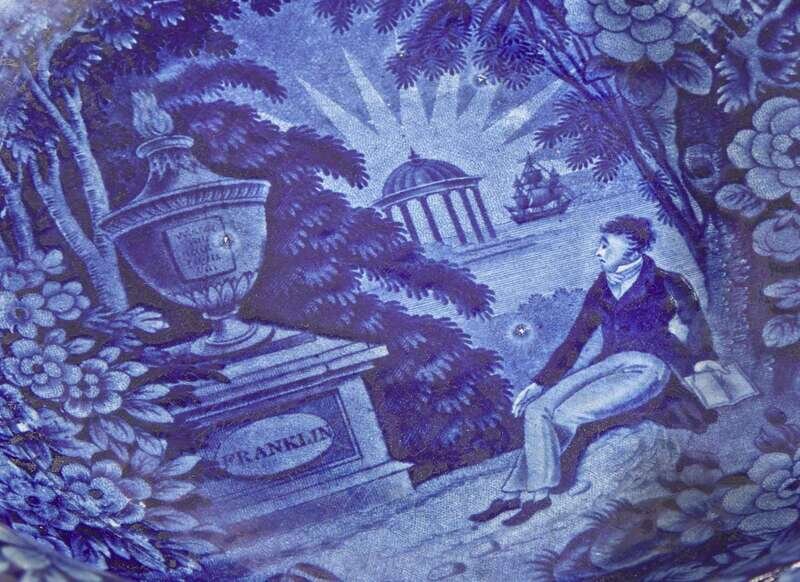 A group of thirteen "Lafayette at the Tomb of Franklin" Staffordshire Historical Blue tablewares; England, first third 19th century