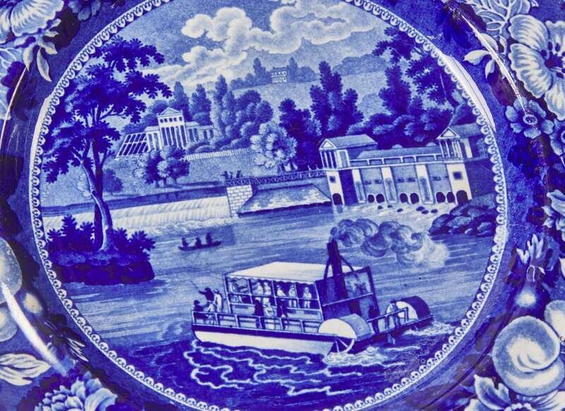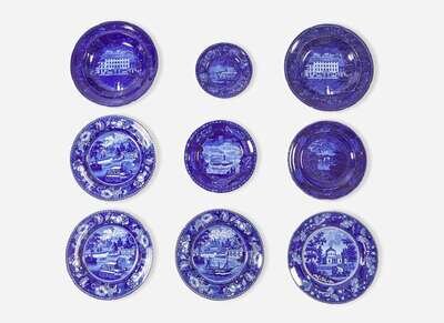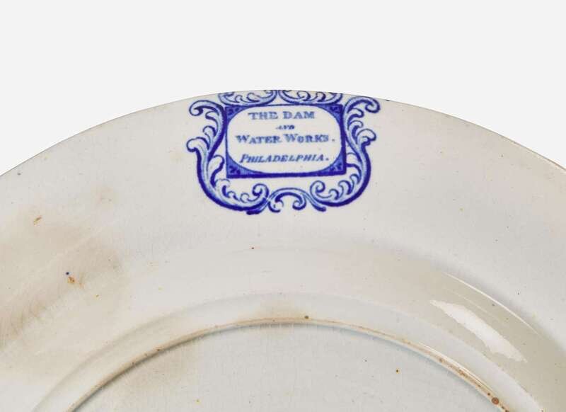 Comprising two soup plates in the “United States Hotel Philada”; three plates in the “Dam and Water Works Philadelphia,” two with paddle steamer and one with steamer flying American flag; one plate in the “Water Works Philadelphia”; a bread plate in water view “Philadelphia”; a plate in the “Gilpin's Mills on the Brandywine Creek”; and a plate depicting the steamship, “Union Line.”